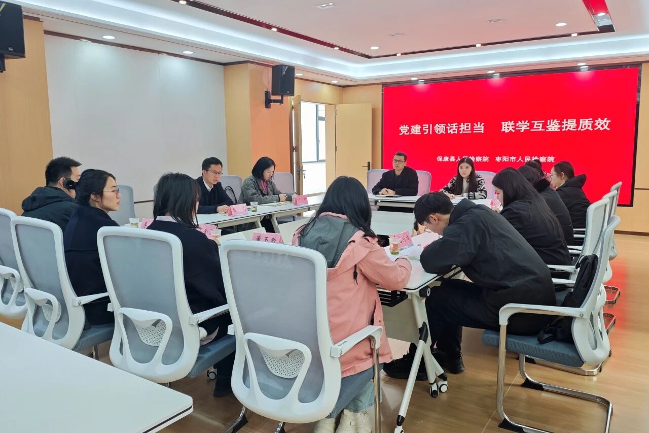 为深化“干部素质和办案质效提升年”活动,切实将党建引领贯穿检察履职全过程,推动党建工作与业务工作深度融合、同频共振,近日,保康县检察院第一党支部与枣阳市检察院第二党支部联合开展“以党的创新理论说办案、讲工作”活动,通过内容充实、形式多样的支部共建和业务研讨,凝聚担当共识,提升履职水平。